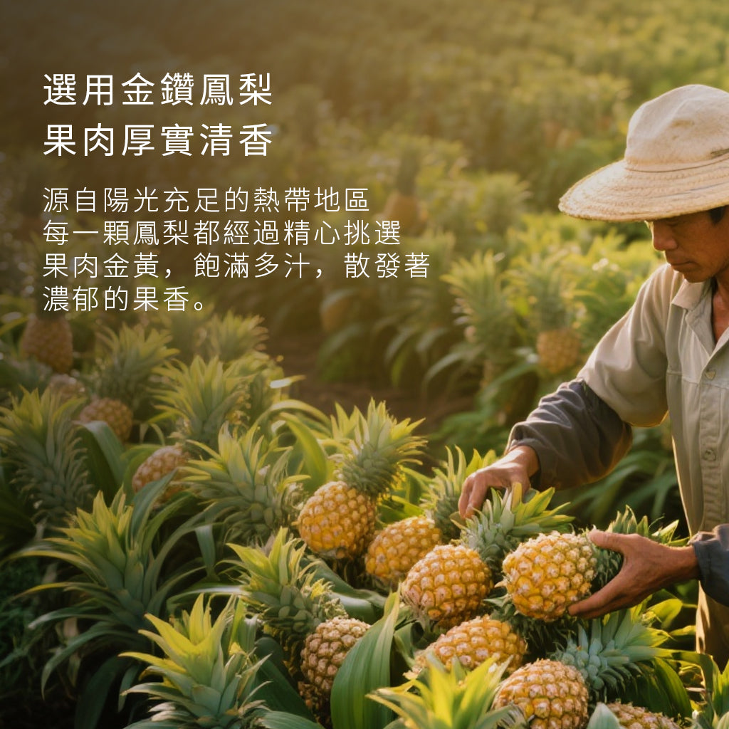 嚴選珍品安吉高山白茶,配上頂級金鑽鳳梨,初烘白茶中的獨有毫香,與馥郁鳳梨果香相融合,