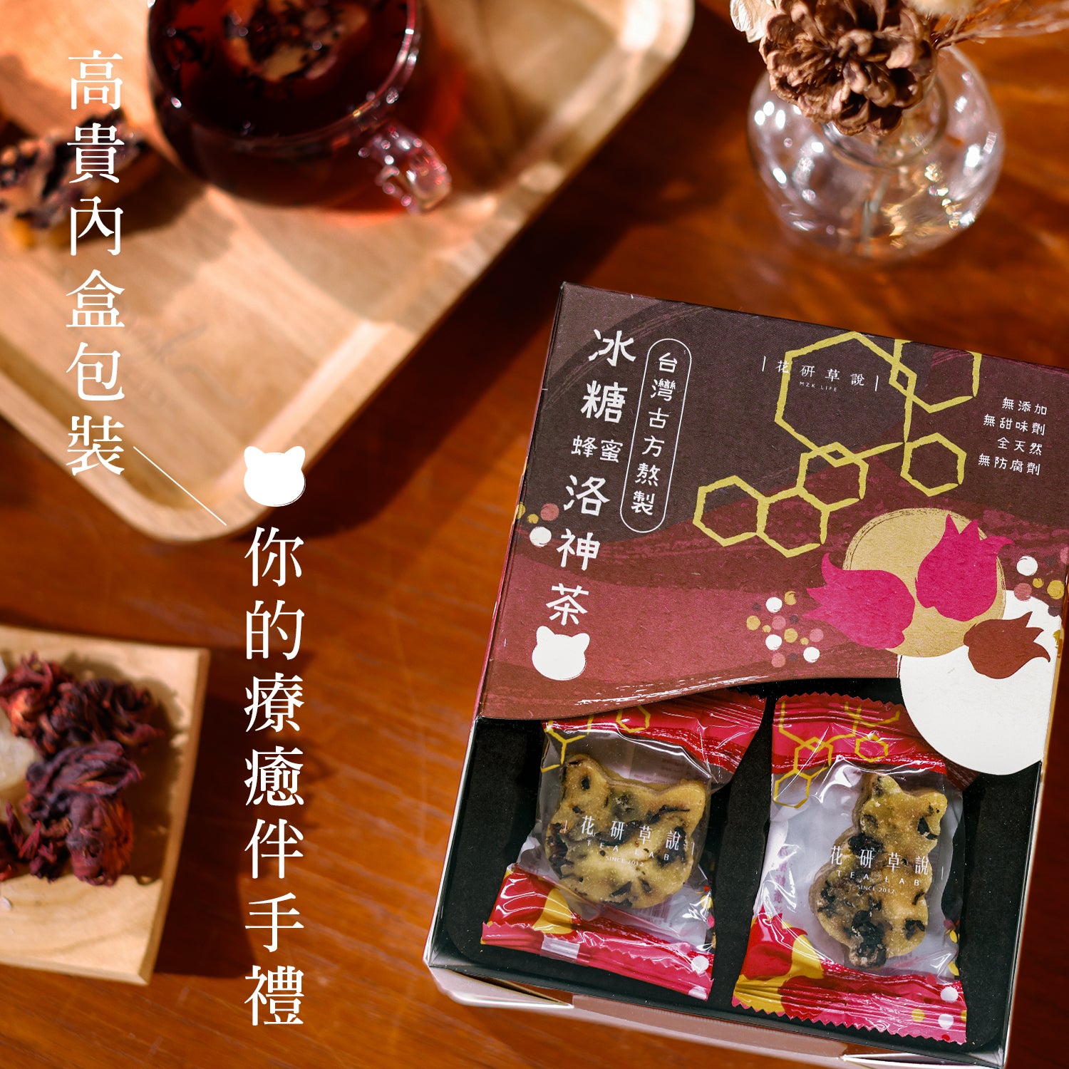 採用被譽為「植物界紅寶石」的洛神花萼,配合頂級玉林甘蔗熬煮的冰糖,加上天然優質蜂蜜,有助養血安神、養顏美容、排毒抗氧。兩款貓造型糖磚以台灣古方,經過1 6道工序匠心熬煮而成。全天然、無添加甜味劑及防腐劑,味道酸甜,花香可口。